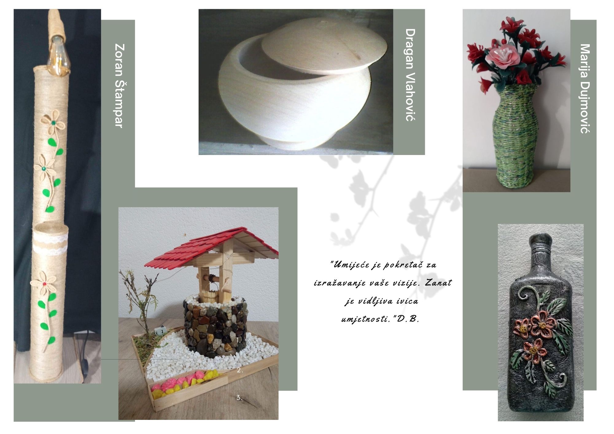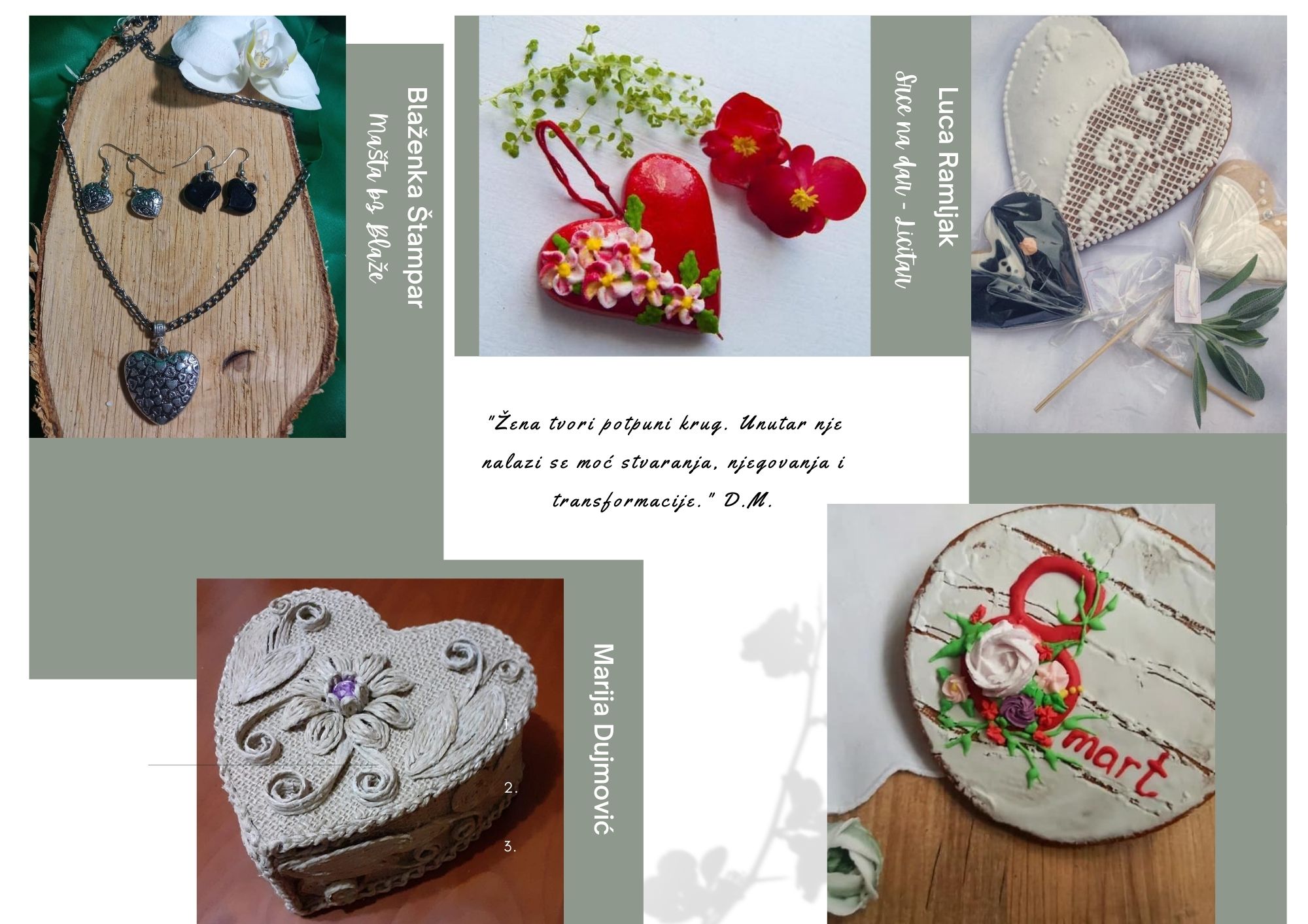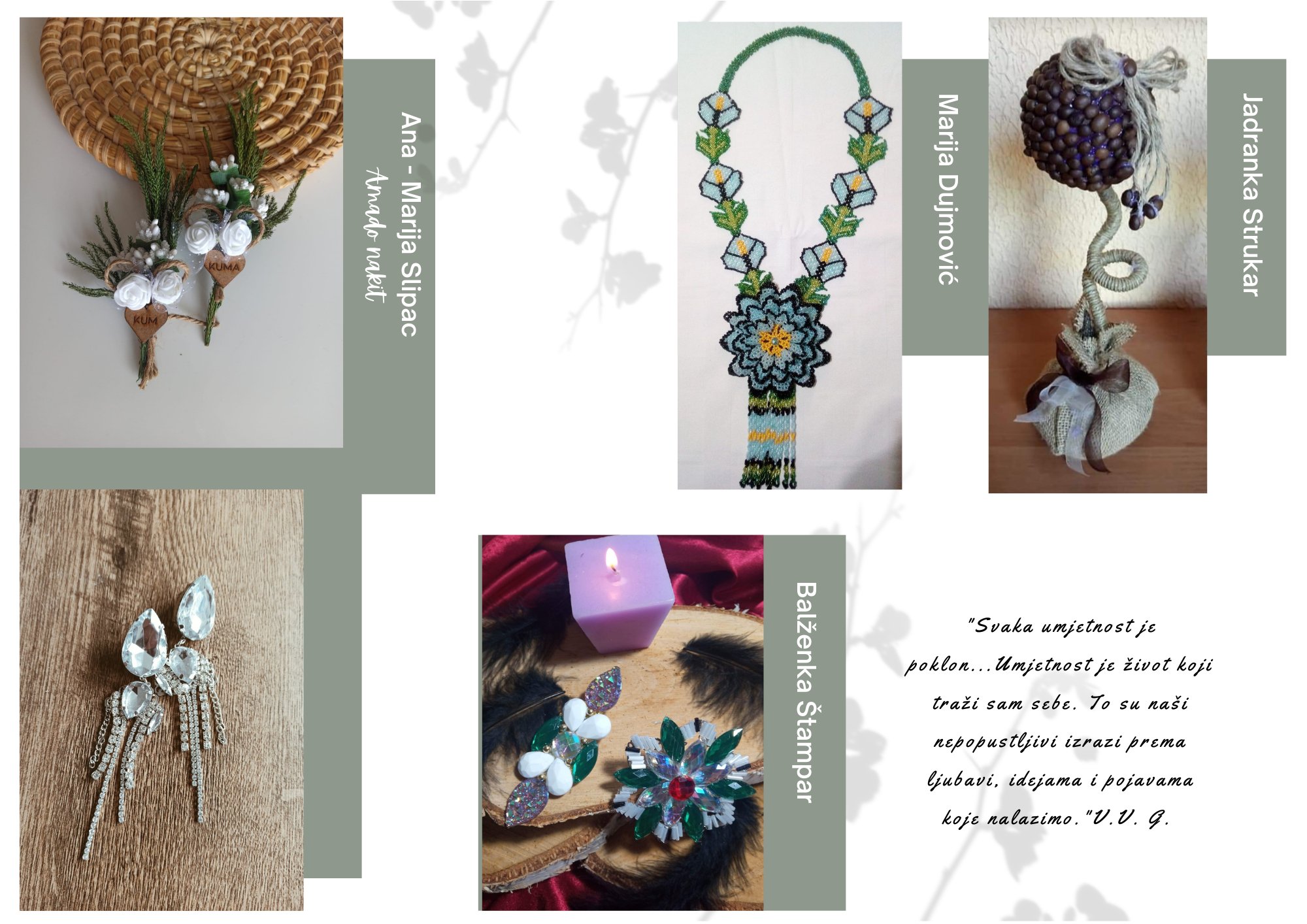 Posjetite naš štand i upoznajte se s našim izlagačima, talerntiranim umjetnicima i zanatlijama. Pronaći ćete niz ručno rađenih proizvoda, od nakita do tradicionalnih nošnji, koji ne samo da su jedinstveni, već podržavaju ekološku odgovornost.